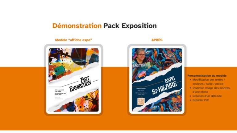 - Annonces d’exposition : affiches papier, visuels web, invitations numériques.