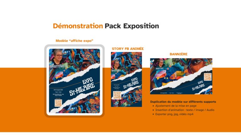 Une même information peut être déclinée facilement en plusieurs formats : affiche papier, post Instagram, story, bannière, PDF